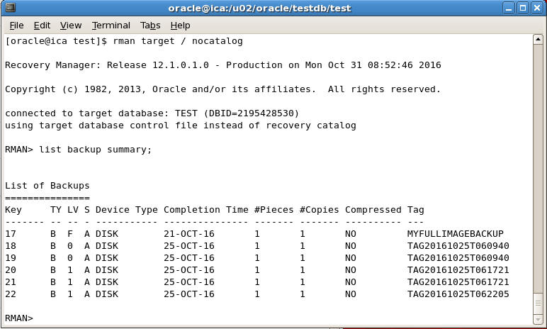 LIST CONTROLFILECOPY ; To list backups of a tablespace use the LIST BACKUP OF TABLESPACE command.